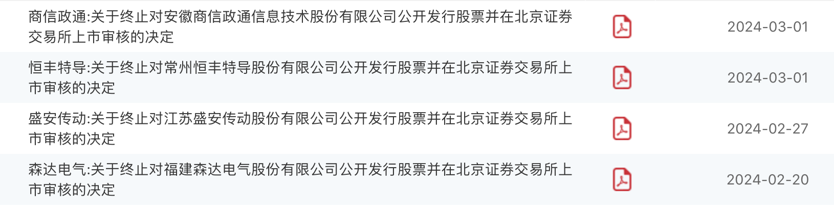 而北交所,也有类似情况,放弃排队选择终止。交易所2月20日披露,森达电气(831406.NQ)终止,2月27日披露盛安传动(831860.NQ)终止,3月1日终止的有两家,分别为恒丰特导(836249.NQ)和商信政通(873876.NQ)。