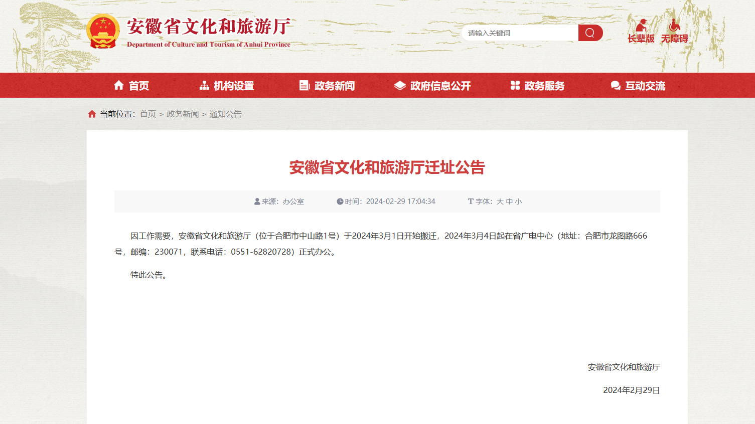 据安徽省文旅厅消息,2月29日,安徽省文化和旅游厅发布迁址公告,其内容如下: