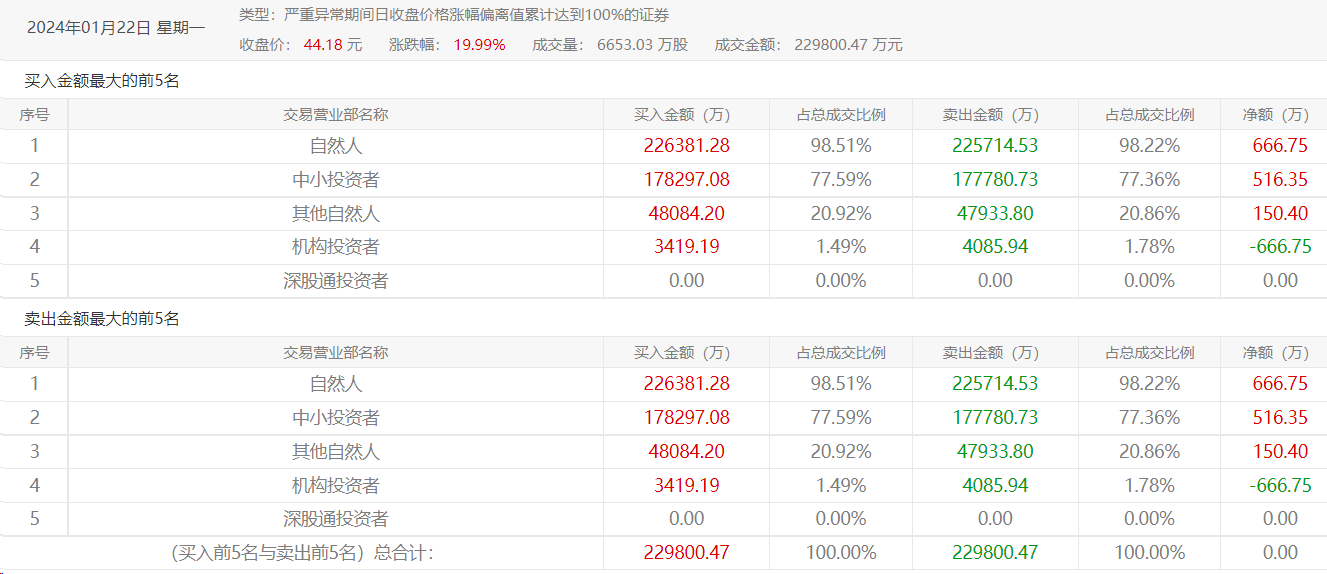 1月22日*ST左江龙虎榜显示,自然人、中小投资者、其他自然人、机构投资者、深股通投资者同时占据了买卖前五席位。当日股价持续上行,并于午后封死涨停板。
