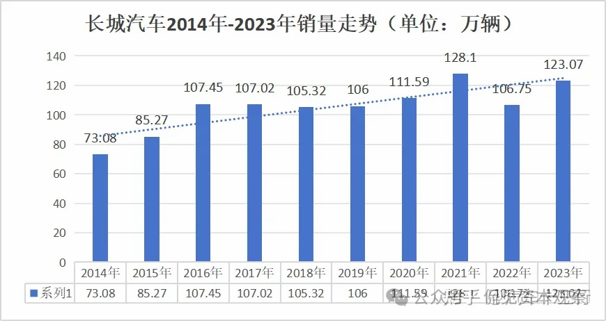 从销量数据来看,2023年长城汽车实现销量为123万辆,同比增长15.29%。虽然销量依旧保持增长,但没有完成160万辆的销量目标。拉长周期来看,自从2016年销量突破百万辆之后,长城汽车的销量就一直在百万上徘徊。