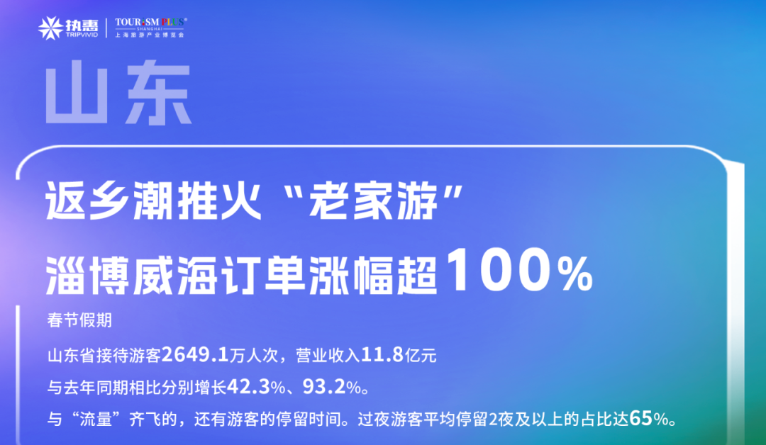 春节假期,山东省接待游客2649.1万人次,营业收入11.8亿元。与去年同期相比分别增长42.3%、93.2%。与“流量”齐飞的,还有游客的停留时间。过夜游客平均停留2夜及以上的占比达65%。