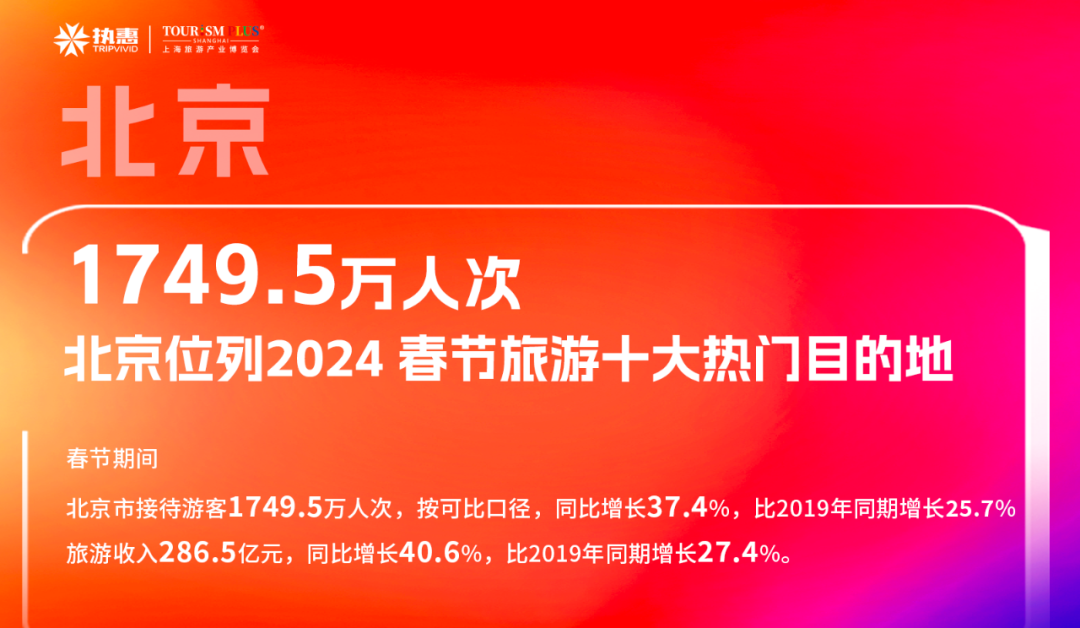 根据北京旅游大数据综合监测,春节期间,北京市接待游客1749.5万人次,按可比口径,同比增长37.4%,比2019年同期增长25.7%;旅游收入286.5亿元,同比增长40.6%,比2019年同期增长27.4%。