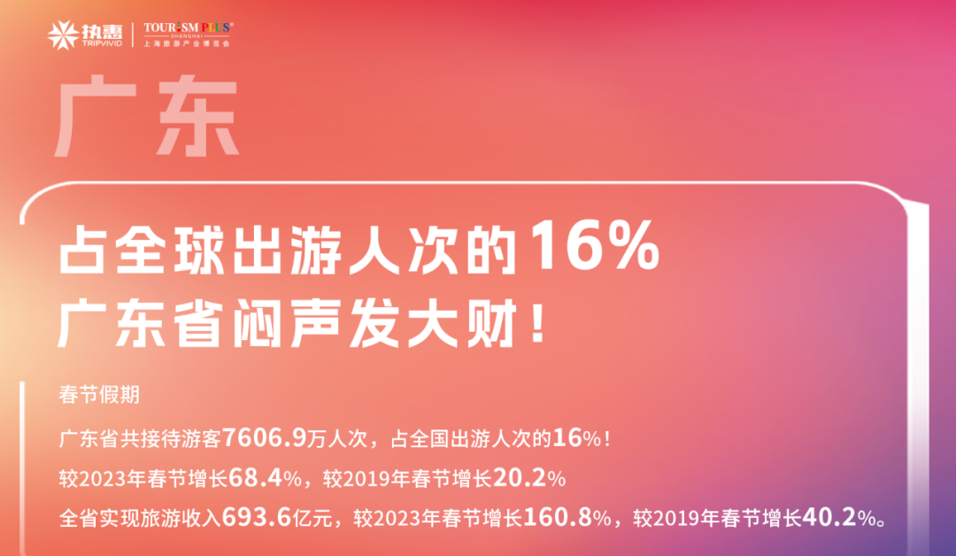 春节假期,广东省共接待游客7606.9万人次,占全国出游人次的16%!较2023年春节增长68.4%,较2019年春节增长20.2%。全省实现旅游收入693.6亿元,较2023年春节增长160.8%,较2019年春节增长40.2%。