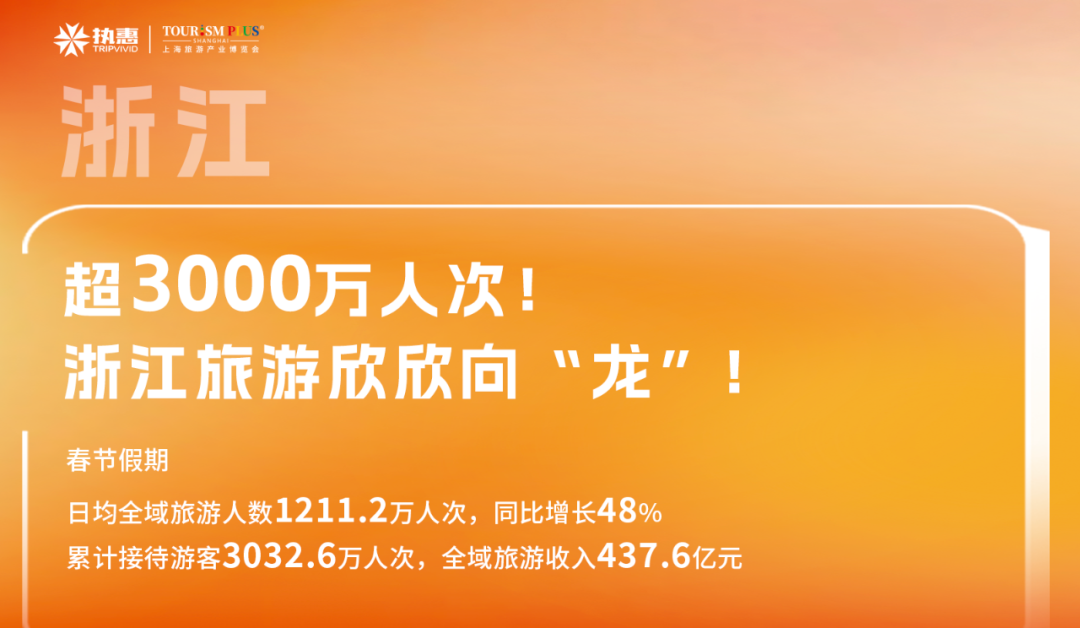 春节假期,浙江省日均全域旅游人数1211.2万人次,同比增长48%,较2019年同期增长30.1%。累计接待游客3032.6万人次,按可比口径较上年增长25.3%,较2019年同期增长25.2%。过夜游客平均逗留天数为4.1天。全域旅游收入437.6亿元,按可比口径较上年增长38.9%,较2019年增长29.9%。