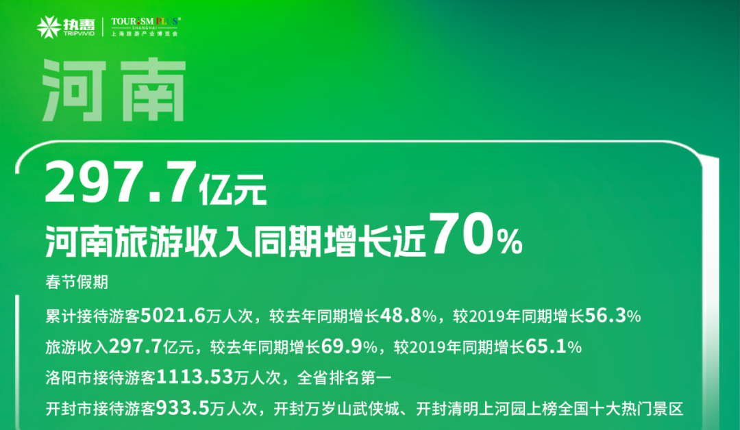 春节假期,河南省累计接待游客5021.6万人次,较去年同期增长48.8%,较2019年同期增长56.3%。旅游收入297.7亿元,较去年同期增长69.9%,较2019年同期增长65.1%。