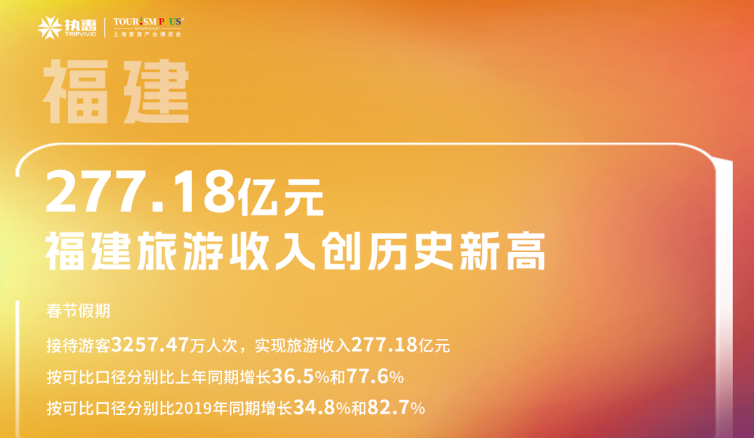 春节假期,福建省接待游客3257.47万人次,实现旅游收入277.18亿元,按可比口径分别比上年同期增长36.5%和77.6%,按可比口径分别比2019年同期增长34.8%和82.7%。