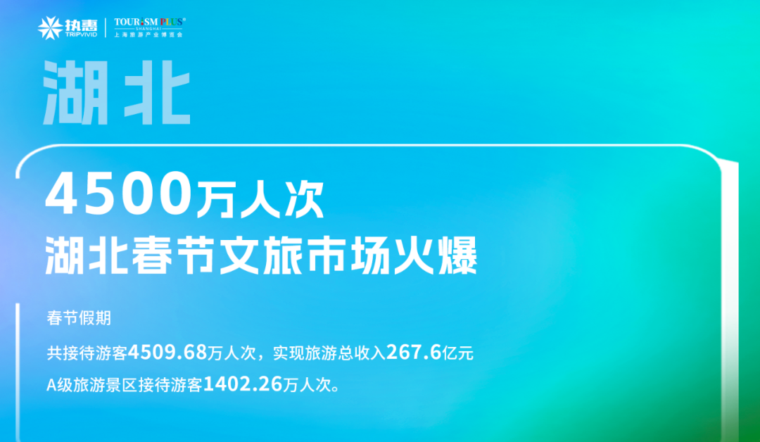 春节假期,湖北省共接待游客4509.68万人次,实现旅游总收入267.6亿元,其中A级旅游景区接待游客1402.26万人次。春节假期期间,湖北省举办了近3000项文化旅游活动,营造出浓厚的节日氛围。同时,累计发放了4000多万元文旅消费券,刺激了市场消费。