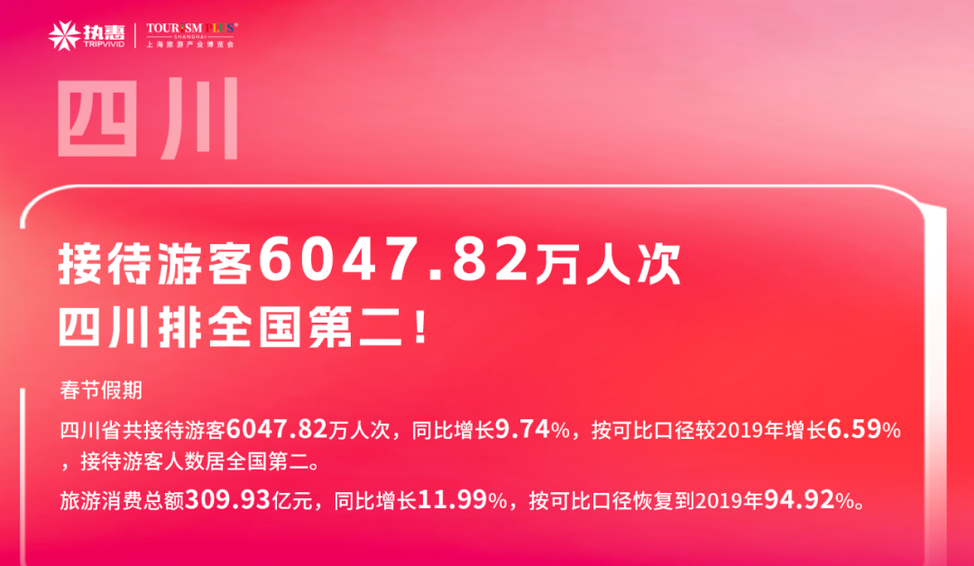 春节假期,四川省共接待游客6047.82万人次,同比增长9.74%,按可比口径较2019年增长6.59%,接待游客人数居全国第二。旅游消费总额309.93亿元,同比增长11.99%,按可比口径恢复到2019年94.92%。