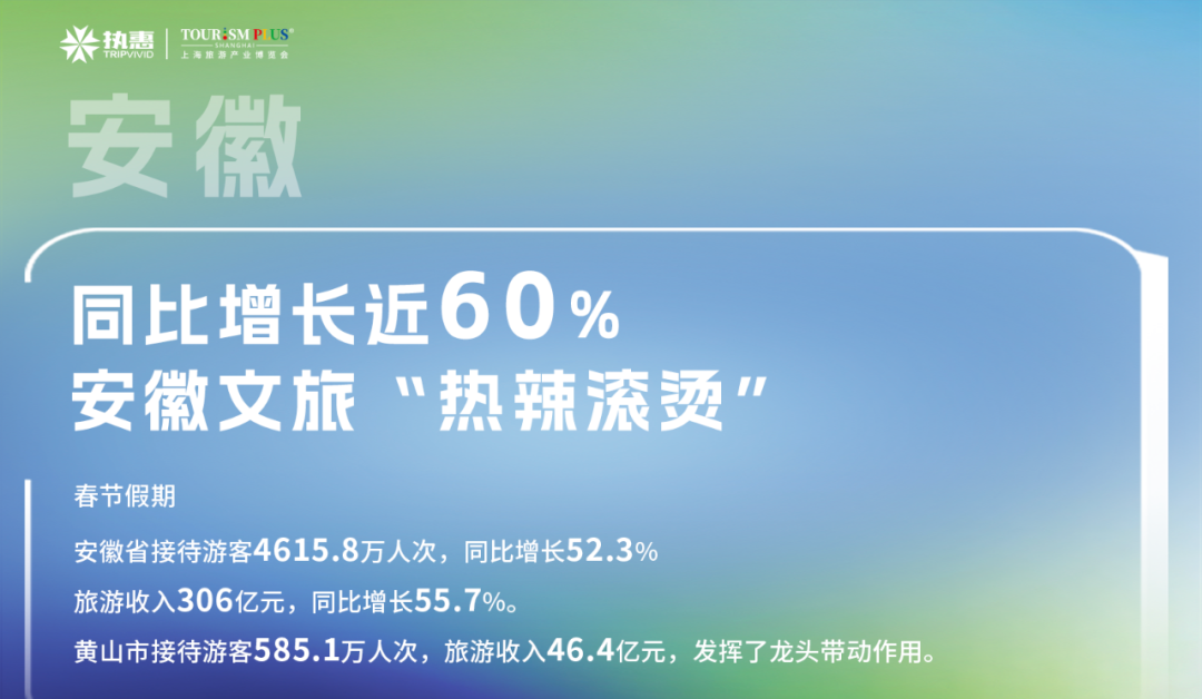 春节假期,安徽省接待游客4615.8万人次,同比增长52.3%,旅游收入306亿元,同比增长55.7%。