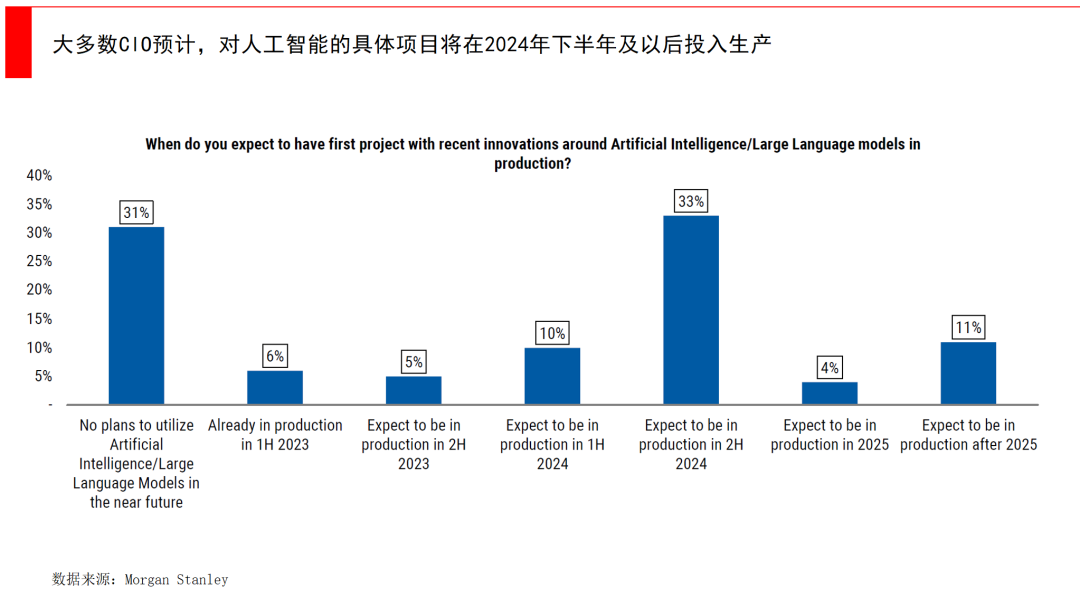 很多投行也进行了调研,试图听听技术高管的意见。据Morgan Stanley针对上百位CIO的调研,最多的人群(33%的CIO)预计,他们的第一个AI大模型项目,将在2024下半年投入生产;15%的CIO预计,这些项目将在2025年或之后投入生产。