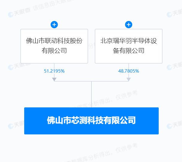 天眼查显示,近日,佛山市芯测科技有限公司成立,法定代表人为郑俊岭,注册资本2050万元,经营范围包含:半导体器件专用设备制造;半导体器件专用设备销售;电子专用设备制造等。股权穿透显示,该公司由联动科技、北京瑞华羽半导体设备有限公司共同持股。