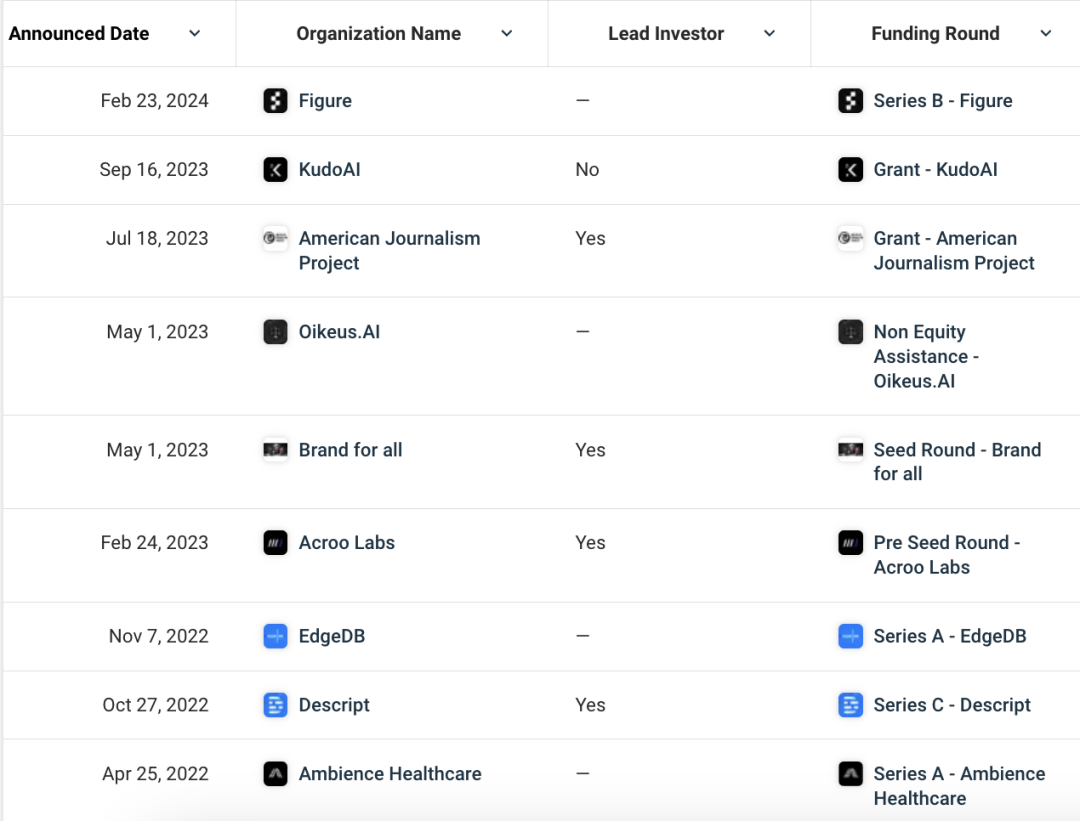 而本身作为被投机构的OpenAI,在2023年也加紧了其AI方向的投资步伐。2022年底,OpenAI推出了创业加速器Converge,在整个2023年一共进行了12笔投资,覆盖了从芯片到硬件、到机器人、再到应用工具等多个领域。