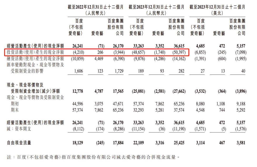 从财报数据看,2023年百度(不包括爱奇艺)投资活动产生的现金支出是486.57亿,比2022年的42.1亿,同比增长1055.75%。