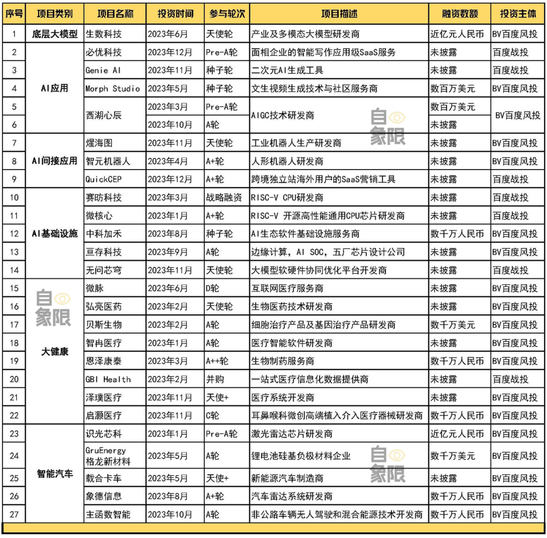 因此,「自象限」也整理了2023年百度的投资版图,试图从中探索百度在AI领域的投资密码。