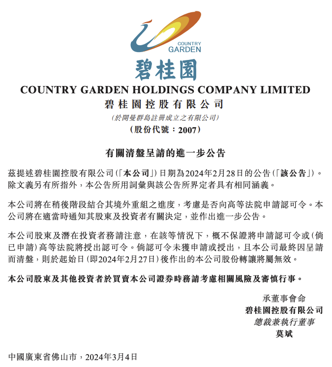 碧桂园3月4日晚间在港交所公告,就有关清盘呈请,公司将在稍后阶段结合其境外重组之进度,考虑是否向香港高等法院申请认可令。公司将在适当时通知其股东及投资者有关决定,并作出进一步公告。