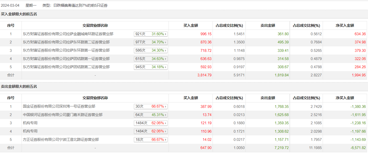 洪涛股份3月4日跌停,龙虎榜数据显示,上榜营业部席位全天成交1.35亿元,占当日总成交金额比例为20.94%。其中,买入金额为4462.69万元,卖出金额为9039.56万元,合计净卖出4576.86万元。