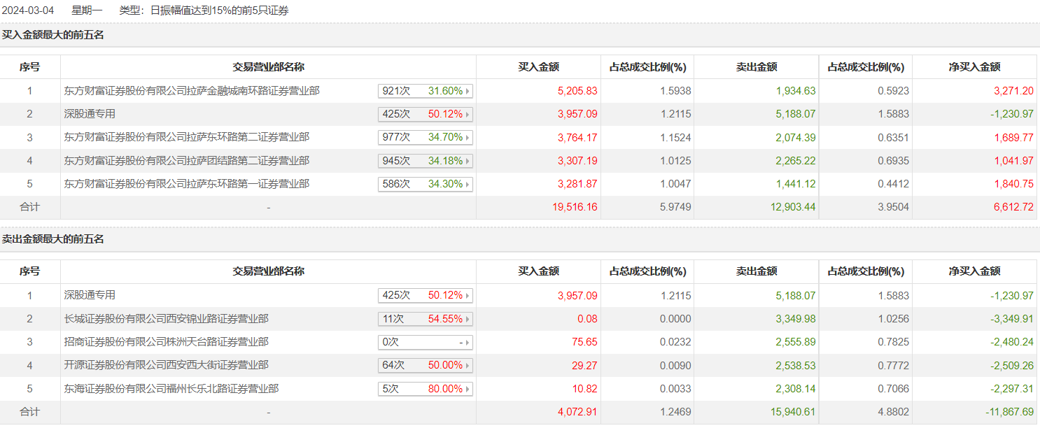 具体来看,深股通专用、长城证券西安锦业路证券营业部分别卖出5188.07万元、3349.98万元;东方财富证券拉萨金融城南环路证券营业部、深股通专用分别买入5205.83万元、3957.09万元。