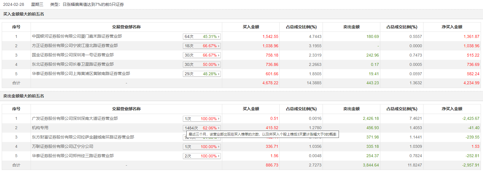 2月28日,国金证券深圳湾一号证券营业部(买入额758.18万元)、方正证券宁波江澄北路证券营业部(买入额1038.96 万元)出现在洪涛股份前五大异动营业部,分别为第三、第二大买入榜营业部。此外,3月4日卖出额1625.68万元的卖出“榜二大哥”中国银河证券厦门嘉禾路证券营业部为洪涛股份2月28日买入榜的“榜一大哥”,买入额1542.55万元。