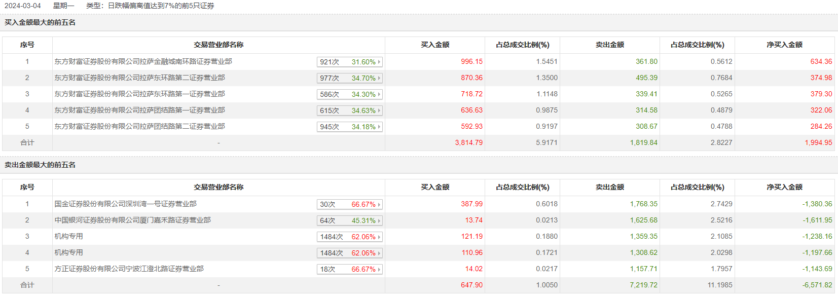 3月4日龙虎榜数据显示,机构逐步撤出洪涛股份,随之而来的是“拉萨兵团”。当日,洪涛股份前五大买入榜营业部均为“拉萨兵团”,卖出榜前五大营业部为国金证券深圳湾一号证券营业部(卖出额1768.35万元)、中国银河证券厦门嘉禾路证券营业部(卖出额1625.68 万元)、2家机构专用账户及方正证券宁波江澄北路证券营业部(卖出额1157.71 万元)。