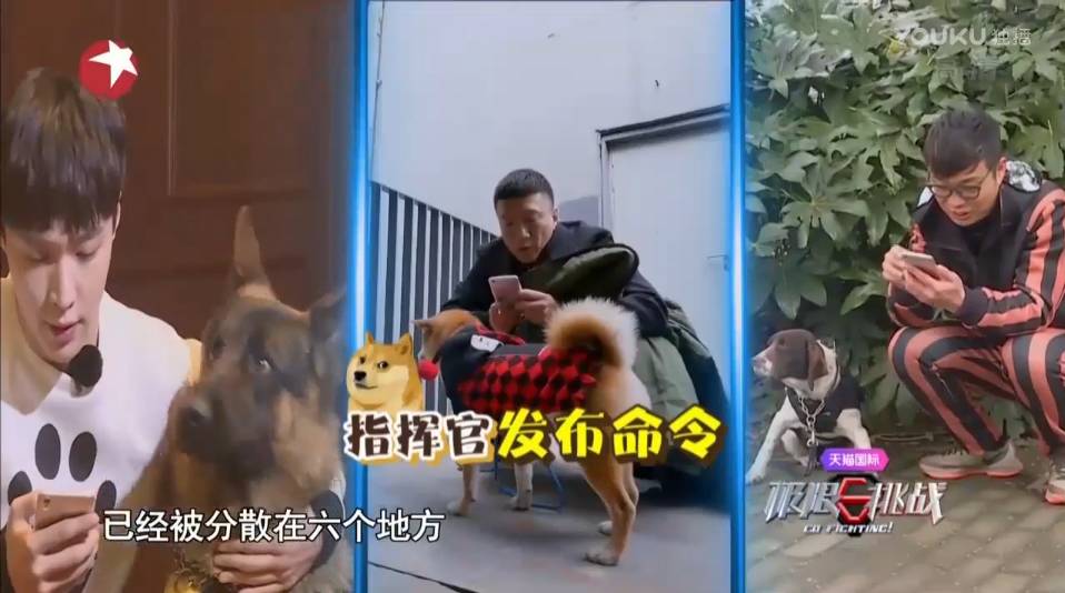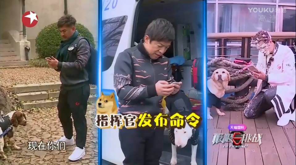 《极限挑战》中某一期各个明星都牵着自己的狗
