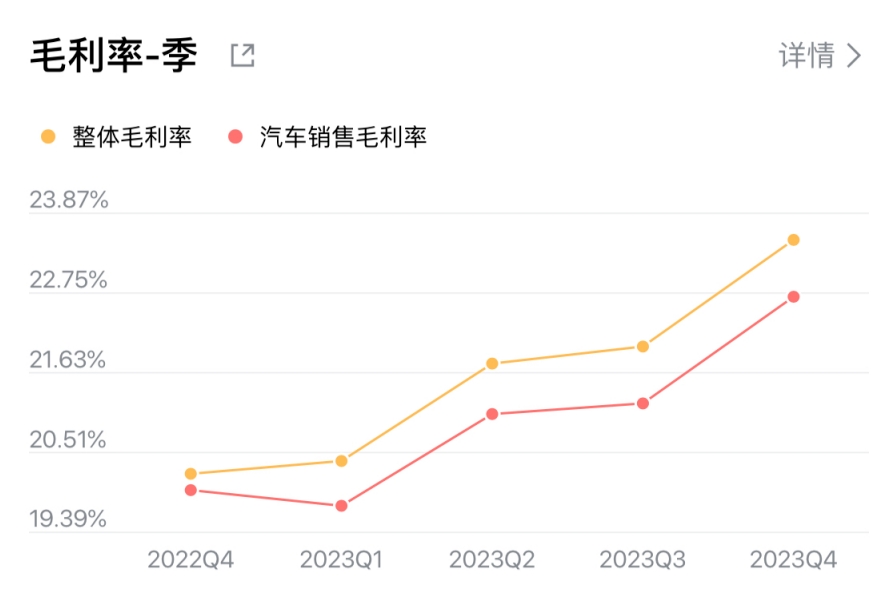 开源节流下,理想汽车毛利率实现了大幅增长,毛利率水平从2022年年末的19.4%增长至2023年年末的22.2%,同期车辆毛利率也从19.1%上升至21.5%。也就是说,如果以理想汽车35万元最终成交价来计算,相当于每卖出一辆车毛利7.5万元。