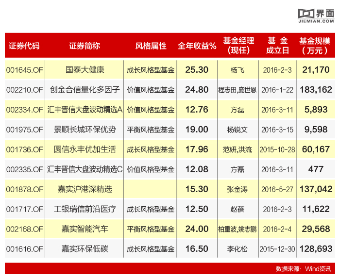 回顾一下2016年的基金整体表现,界面新闻从全年收益率、波动率、择时与选股四个维度综合评估,梳理出综合表现最优的股票型基金红榜如下: