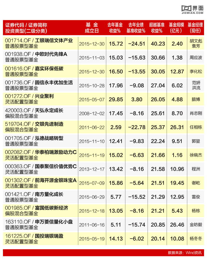 此外,界面新闻亦从相对业绩的维度,筛选出去年业绩大幅超越基准的基金名单如下(超越基准收益大于20%):