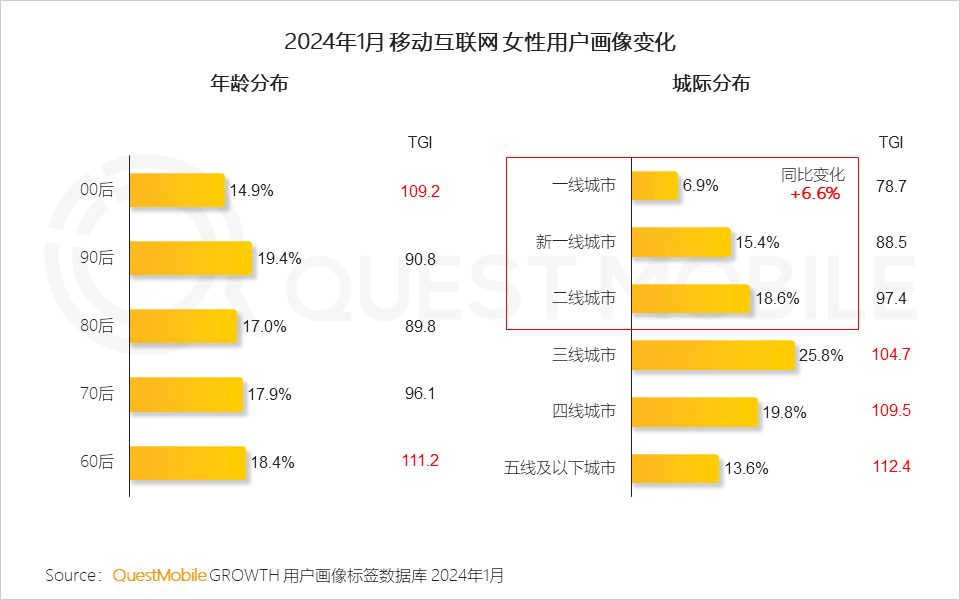 QuestMobile数据显示,过去一年来,女性群体在移动互联网中的占比持续提高至49.5%,截止到2024年1月,女性用户月活规模达6.08亿,同比增长1.9%,这其中,90后占比最高,达19.4%,二线及以上城市用户同比增长了6.6%。
