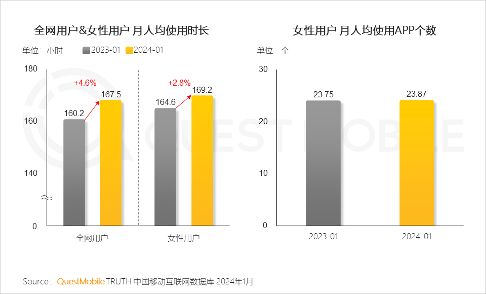 QuestMobile数据显示,2024年1月,女性用户移动购物APP月人均使用时长达13.9小时,较去年同期的10.1小时增长了38.5%。