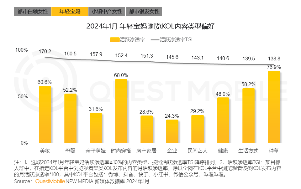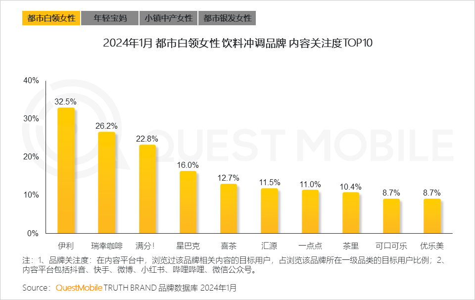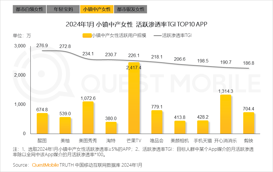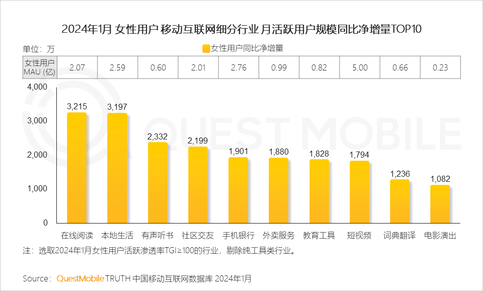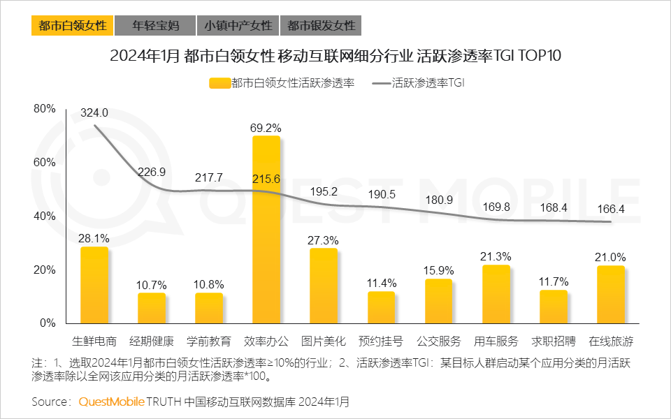 QuestMobile数据显示,2024年1月,线上消费能力在2,000元以上的女性用户占比达32.8%,同比增长2.2%。