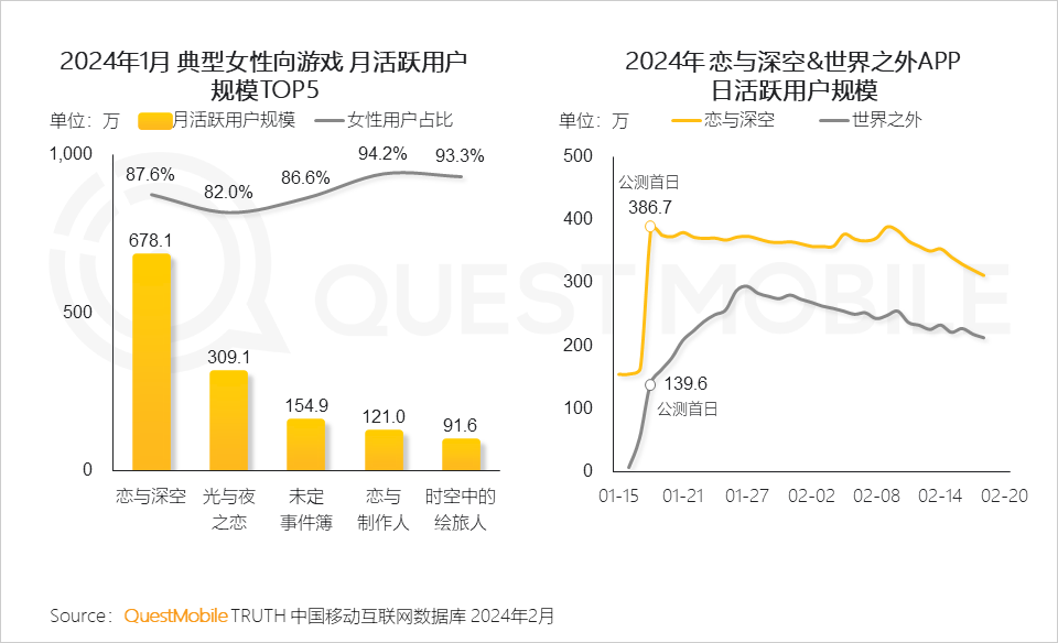 而在手机游戏方面,叠纸游戏的新作《恋与深空》与网易游戏的《世界之外》同期上线,打响女性用户之争。
