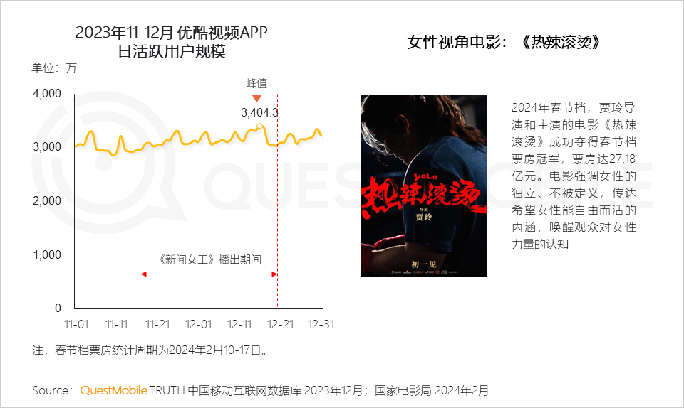 2、“她题材”的影视作品兴起,近期演绎女性视角的剧集《新闻女王》及电影《热辣滚烫》均实现破圈,在社交媒体平台中掀起对“她力量”的讨论热潮