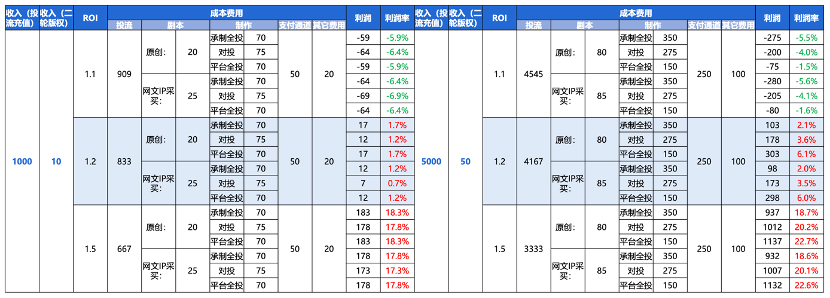 将投流ROI(收入与投流投入比)划分为1.1,1.2和1.5三个档次, 综合行业不同模式下的成本,可以发现无论是1000万收入还是5000万收入,投流ROI低于1.2是要面临严重亏损风险的,1.2也可视为行业的盈利平衡点。