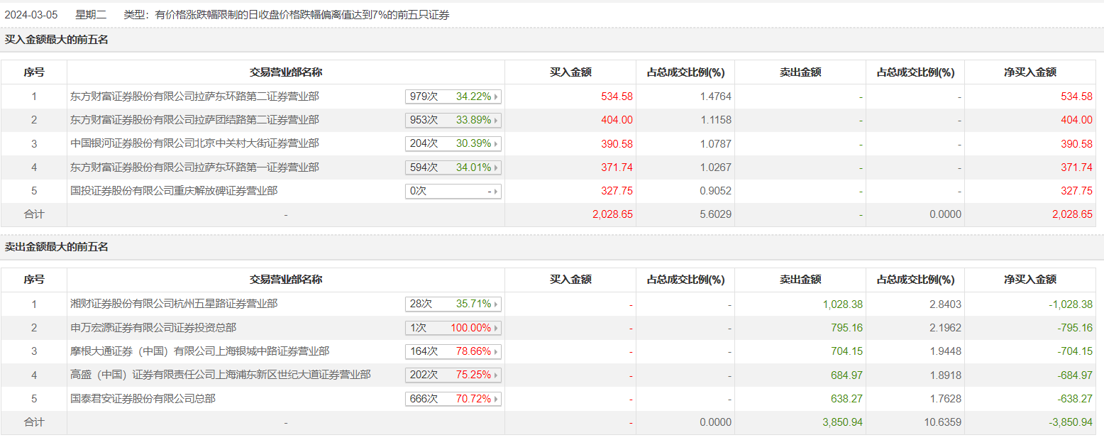 具体来看,湘财证券杭州五星路证券营业部、申万宏源证券有限公司证券投资总部分别卖出1028.38万元、795.16万元;东方财富证券拉萨东环路第二证券营业部、东方财富证券拉萨团结路第二证券营业部分别买入534.58万元、404.00万元。
