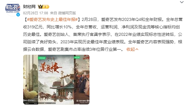 2021年底,“爱优腾十年烧光1000多亿元”的热搜话题令人印象深刻。那是很长一段时间内,长视频行业的缩影:钱没少烧,却难办成事。平台不盈利,剧集不出彩,投资人和网友们都难满意。那时的风向是,长视频不是一门好生意,没有新故事,更没有未来。但仅仅时隔两年后,局面就出现了反转。近日,爱奇艺(IQ.US)发布的财报显示,2023年公司总营收319亿元,同比增长10%,净利润19亿元,而2022年净亏损为1.36亿元。且自2022年四季度以来,爱奇艺已经连续五个季度盈利。