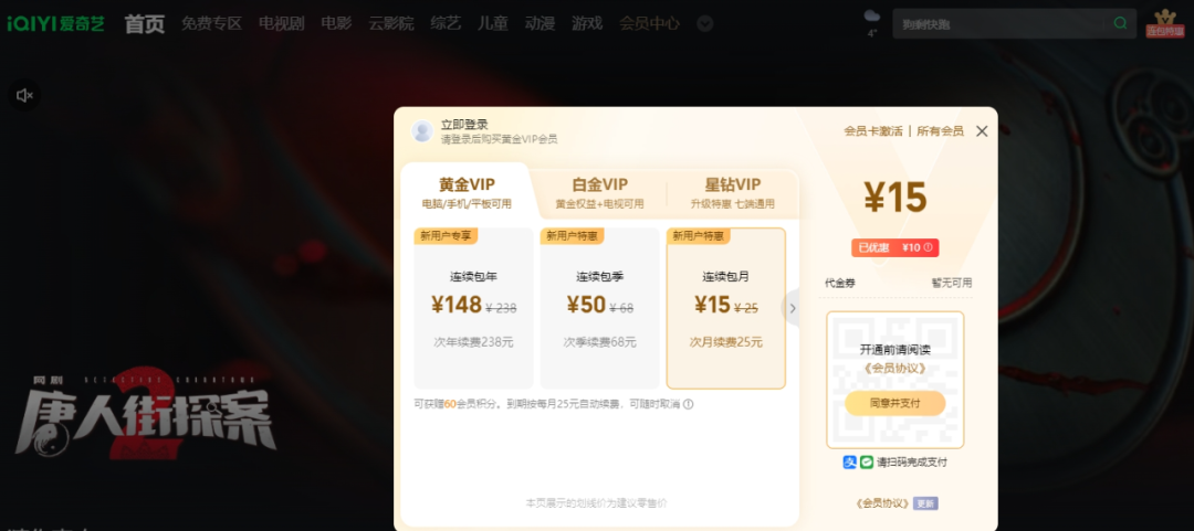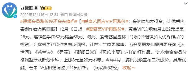 目前,爱奇艺黄金VIP的连续包月和连续包年的价格(优惠前)已经分别达到了25元、238元;而在2020年第一次涨价前,价格则是15元、178元。