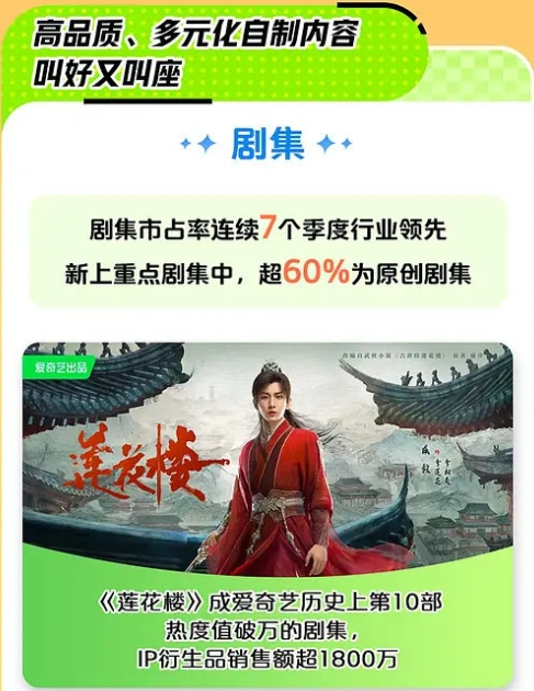 换言之,在维持头部爆款内容的基础上,爱奇艺工业化影视作品的“下限”有所提升,中上等水准的剧集变多了。这对于在提价的同时不损失掉过多用户,以及促进招商转化是有效果的。