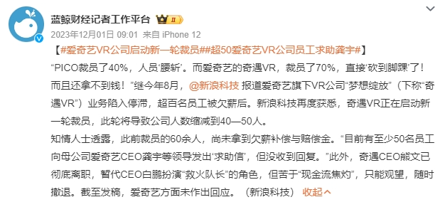 2023年12月,据“新浪科技”报道,梦想绽放开启新一轮裁员,年初170余人的团队,只剩下40-50人,原CEO熊文更是早在10月就已离职。公司的很多新项目难以维系。