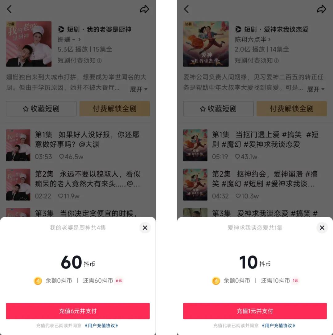 对比之下,目前抖音短剧栏目首屏热剧的单剧总播放量最高能达到4亿以上,而且个别剧集解锁全集的费用远远低于随刻。
