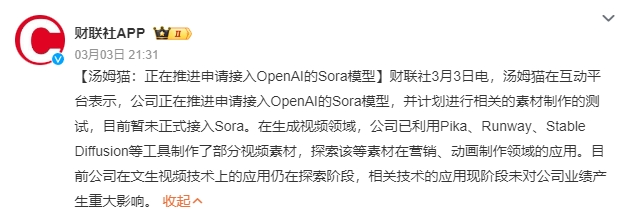 不过,毕竟AI迭代的速度很快,从ChatGPT面世,到Sora出现,也还不过一年多的时间。360集团创始人、董事长周鸿祎甚至表示,Sora意味着AGI(通用人工智能)实现可能从10年缩短至一两年。