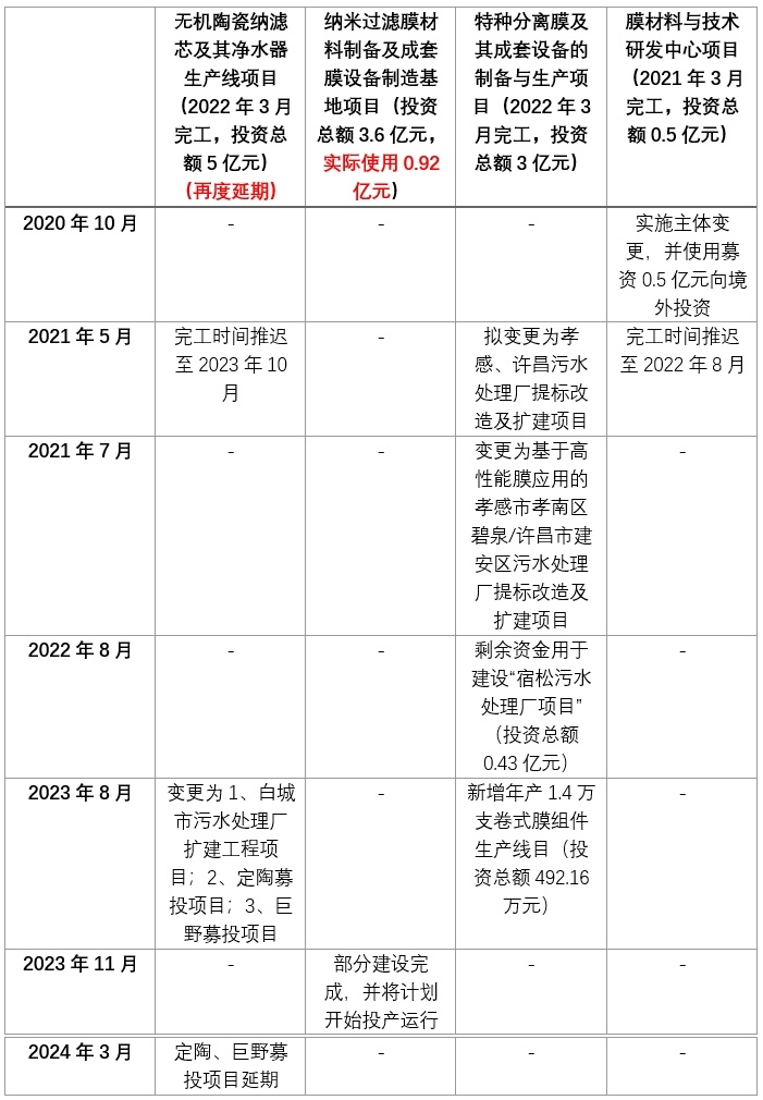 拟投资总额3.6亿元,实际使用0.92亿元,结余募集资金共2.77亿元(含利息收入)。2023年11月公告显示,截止2023年10月,上述项目已部分建设完成,并计划开始投产运行。不过,原本计划建成12条膜生产线,实际建成4条;原本计划建成3条先进膜组件生产线,实际未建设实施;原本总建筑面积7.34万㎡,实际建成约2.55万㎡。