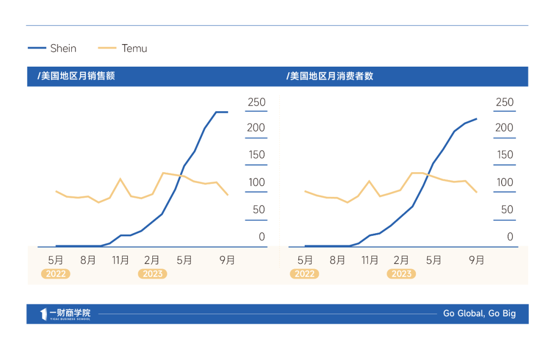 (图注:SHEIN和Temu销售额与消费者数对比,数据来自彭博社)