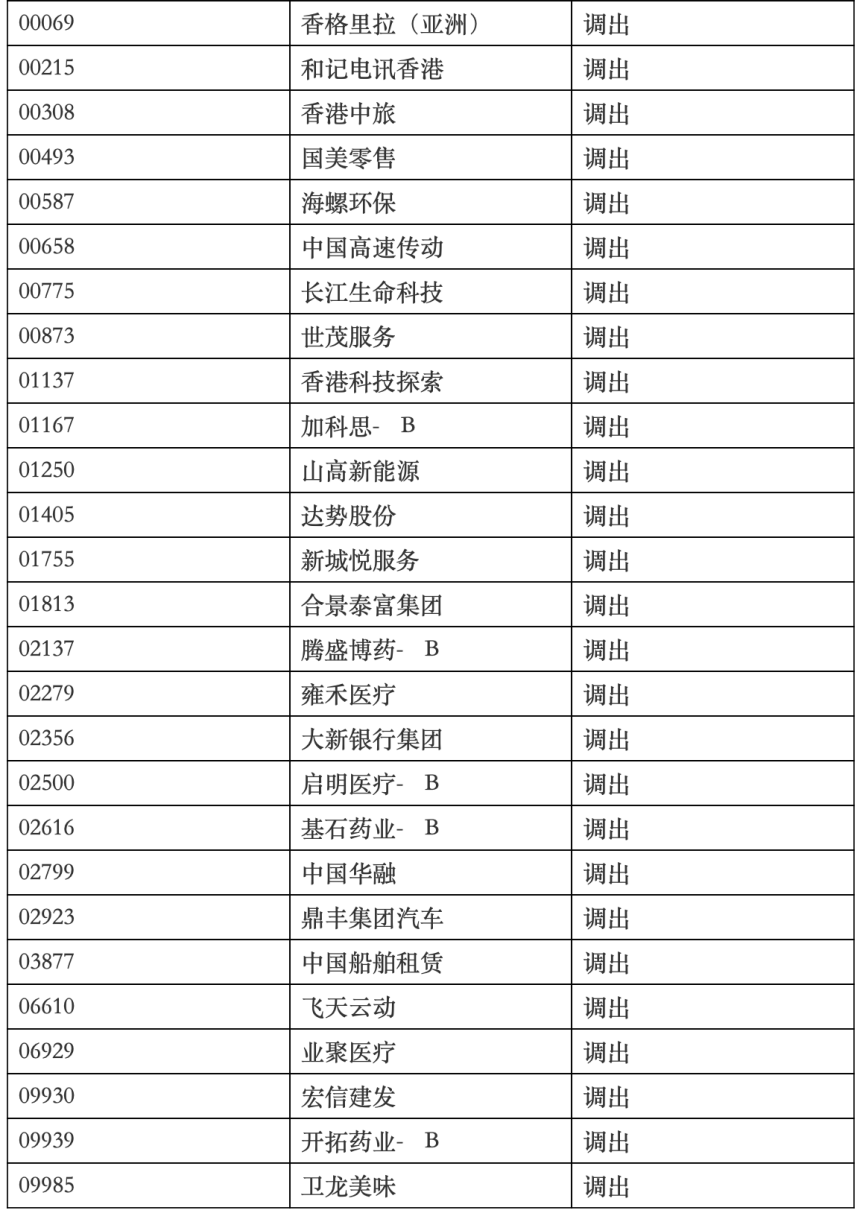 飞天云动(6610.HK)、国美零售(0493.HK)和包括开拓药业-B(9939.HK)、基石药业-B(2616.HK)、腾盛博药-B(2137.HK)在内的多只医药个股被调出。当日部分被调出的个股暴跌,其中飞天云动、腾盛博药、国美零售(0493.HK)、雍禾医疗(2279.HK)、加科思-B(1167.HK)分别下跌约33%、27%、27%、22%、21%。