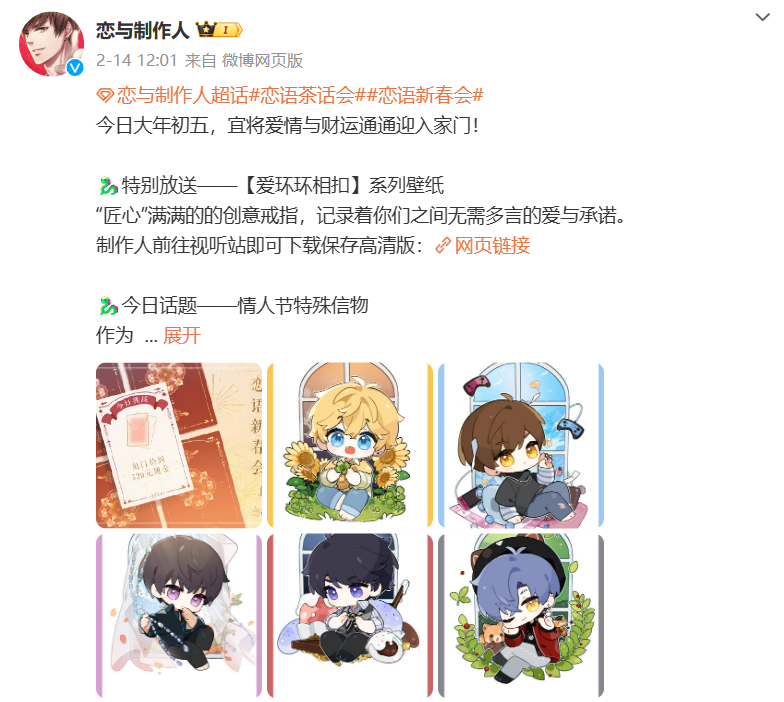 这种单纯被兴趣爱好所驱动的创作和传播,对于乙游是不可错过的免费宣传机会,官方也时常举办有着丰厚奖励的同人创作活动。也有《恋与制作人》那般直接给出角色Q版形象模板,巧妙降低创作门槛又给予玩家充分发挥空间,从而使其收获参与感。