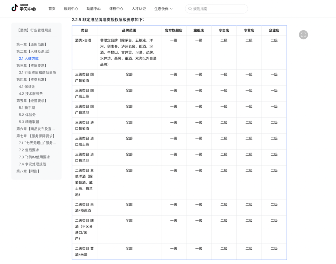 酒讯注意到,根据抖音官方发布的《【酒类】招商管理规则》,酒类抖店仅允许申请旗舰店、专营店、专卖店,针对啤酒、葡萄酒、洋酒、香槟、气泡酒三级类目和白酒三级类目,分别就三类店铺提出具体要求,其中,茅台、五粮液、洋河、剑南春等27个白酒品牌需要提供一级授权。从店铺类型到销售类别再到品牌授权,平台对酒类抖店的约束在不断细化的管理规则中层层加码。