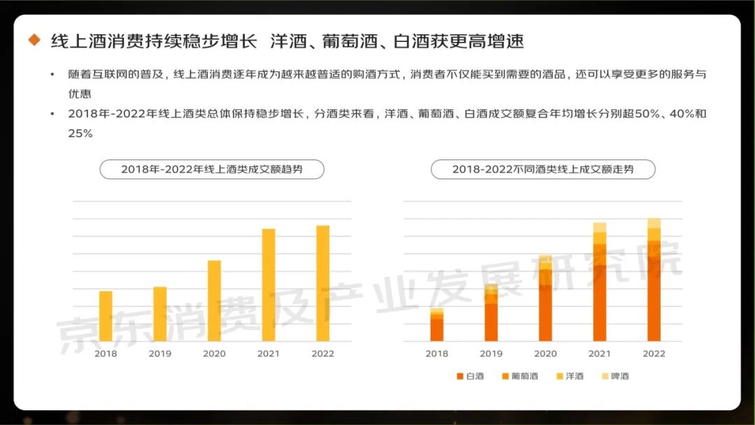 《2023线上酒类消费趋势报告》显示,2018年-2022年线上酒类总体保持稳步增长,洋酒、葡萄酒、白酒成交额复合年均增长分别超50%、40%、25%,获得更高速的增长。