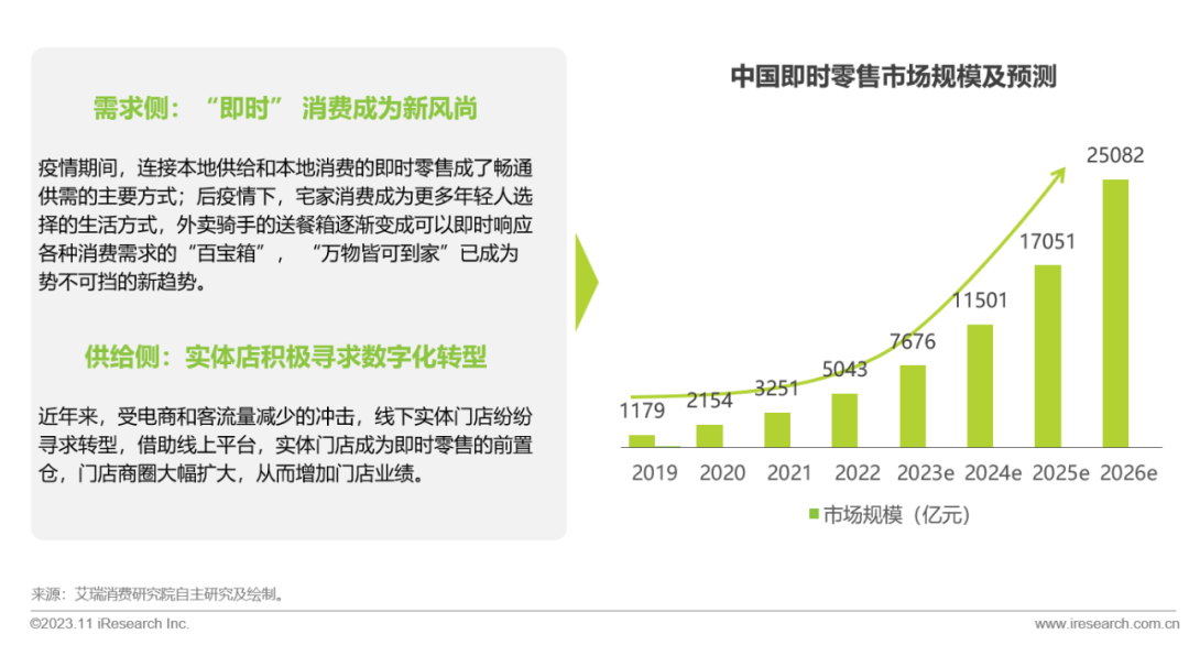 《即时零售行业研究报告(2023)》显示,即时零售2022年市场规模为5042.86亿元,预计2025年市场规模将达到2022年的3倍,增长空间十分广阔。