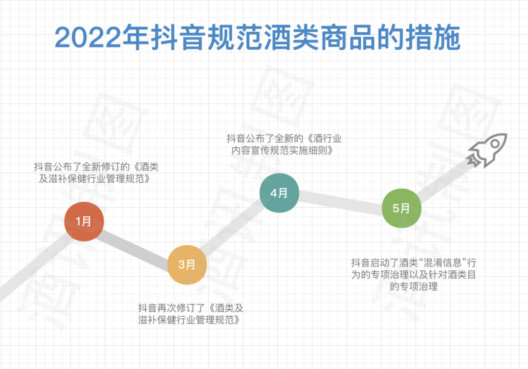 酒讯梳理发现,2022年1月,抖音公布了全新修订的《酒类及滋补保健行业管理规范》,新增酒类商品宣传过程中,不得含有现场调配、灌装酒的相关行为。3月,抖音再次修订了《酒类及滋补保健行业管理规范》,新增酒类特殊品牌单品经营定准和酒类类目清出标准。4月,抖音公布了全新的《酒行业内容宣传规范实施细则》,明确禁止虚构原价、价格虚假行为,严禁商家和创作者通过不合理的比价方式,诱导消费者购买其直播间的推荐商品。此后,还启动了酒类“混淆信息”行为的专项治理以及针对酒类目的专项治理。