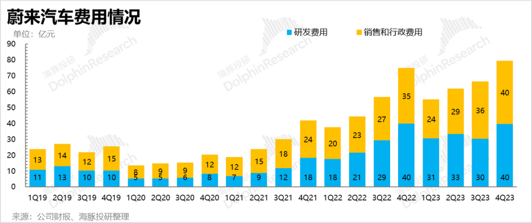 5. 还是生命不休,烧钱不止:四季度经营费用花样创新高,双费各达40亿。其中营销和管理费,因为公司加大渠道铺设、快速新增销售人员,再加上NIO Day等活动。研发因新品投入和增加增设研发职能,单季环比直接拉了10个亿。