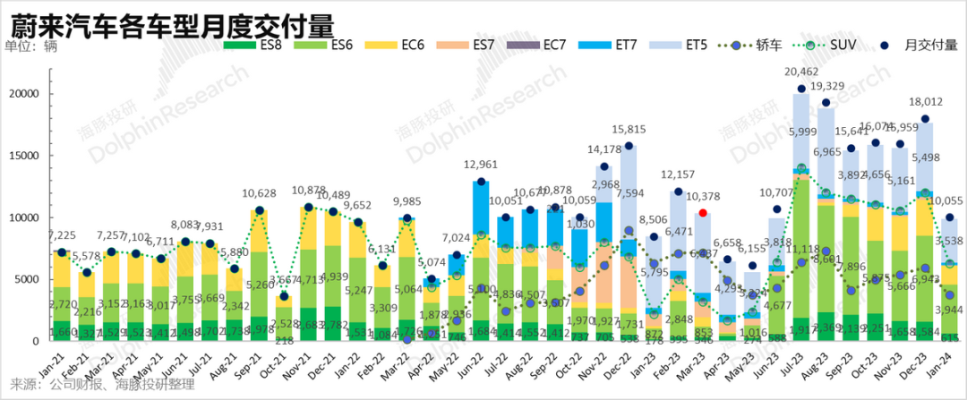 但蔚来目前的车型改款力度小,且产品力不足,按照目前的销量趋势来看,海豚君预计现有车型仅能贡献2024年全年16-18万的销量,所以从经营周期来看,蔚来恐怕即使好转也得要到下半年看阿尔卑斯出来时候的情况(但预计4Q才能贡献销量)。